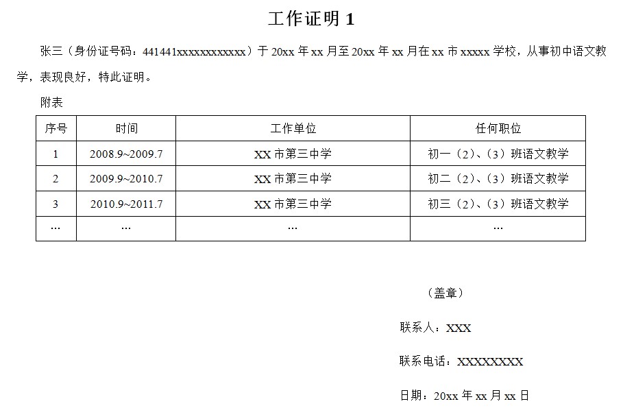 (3)若申报人在现单位的专技工作资历未满资历条件要求的,必须提供前单位的详细工作证明(必须加盖前单位公章)。建议参考工作证明1开具;