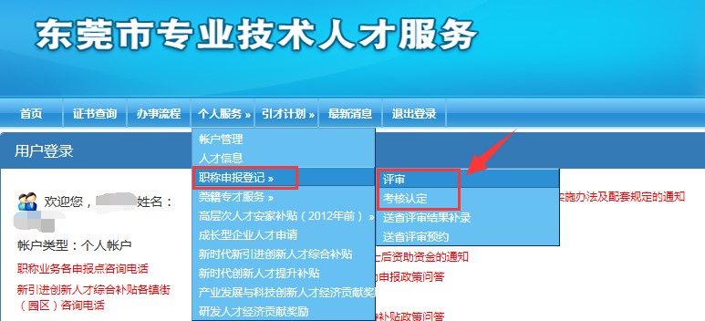 三、个人线上申报:①申报人登陆系统,点击“人才信息管理”,完善个人信息。②选中“个人服务”菜单中的“评审”或“考核认定”,如下图: