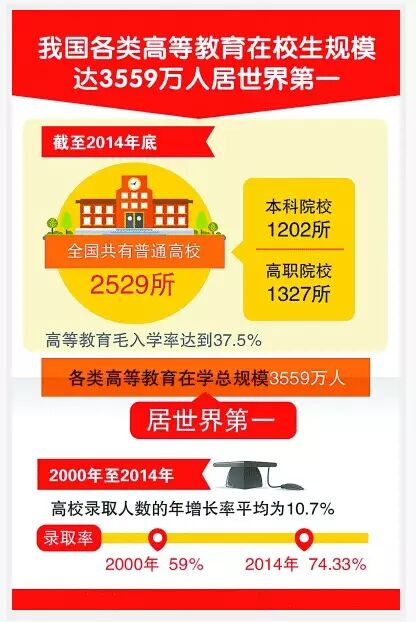 从2000年至2014年,中国高考报名人数从375万人增至939万人,全国高校录取人数从220万人增至697万人,录取率由原来的59%提高到了74%。